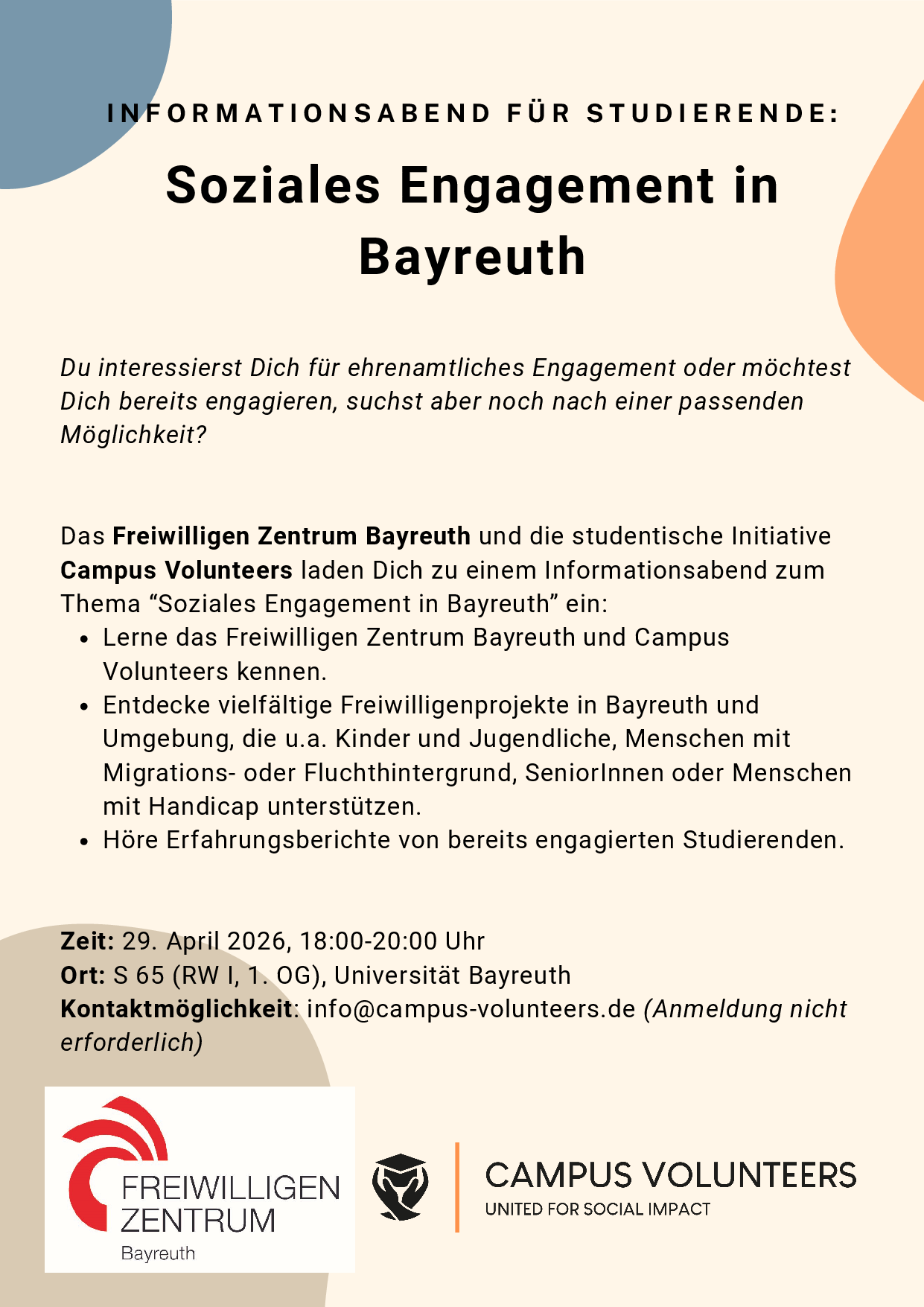 Das Freiwilligen Zentrum Bayreuth und die studentische Initiative Campus Volunteers laden Dich zu einem Informationsabend zum Thema „Soziales Engagement in Bayreuth“ ein: